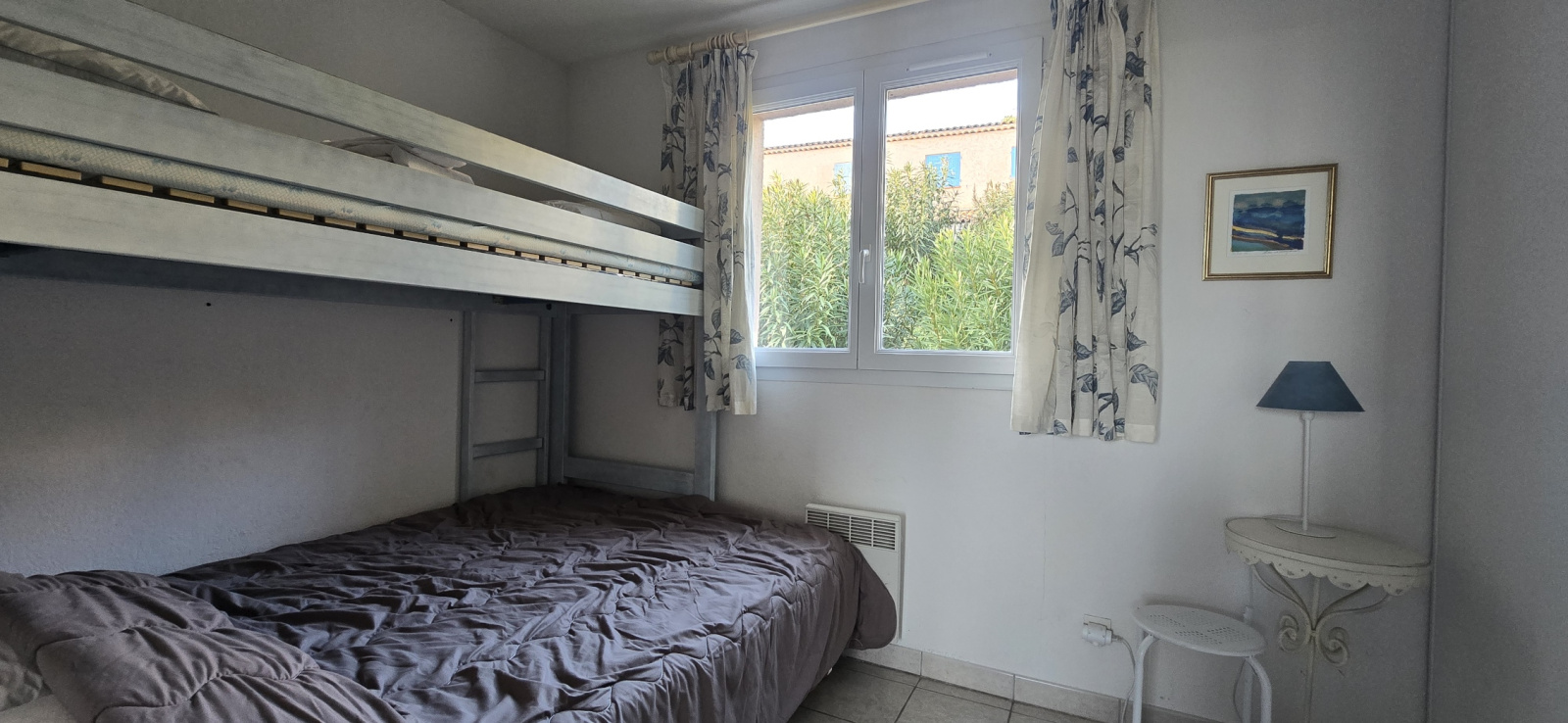 La maison dispose également d'un garage d'environ 20m2. Prestations complémentaires : climatisation, volets aluminium, et fenêtres PVC double vitrage. Idéal comme pied à terre ou comme investissement locatif.