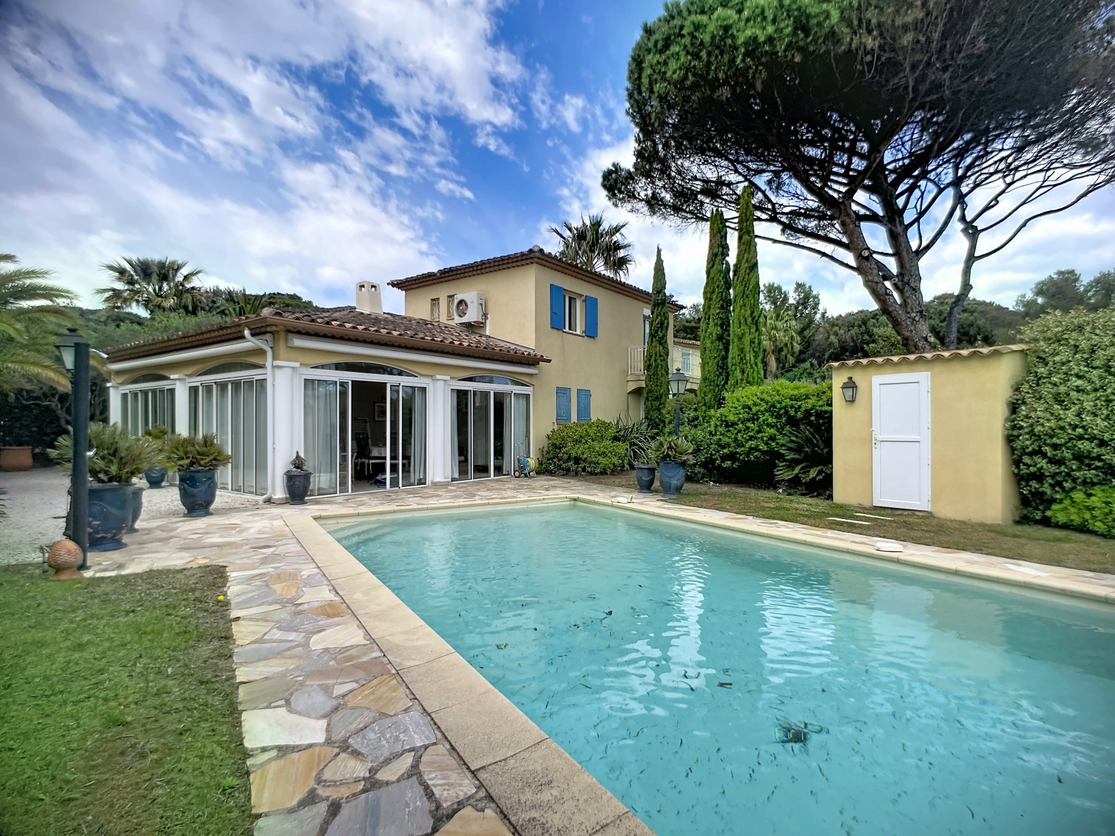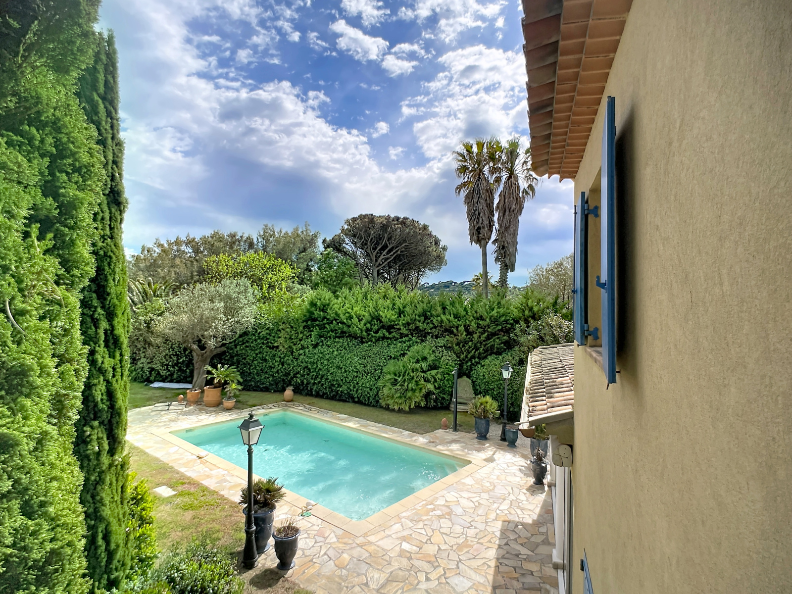 A l'extérieur, un jardin joliment arboré invite à la détente, agrémenté d' une piscine, idéale pour les beaux jours.