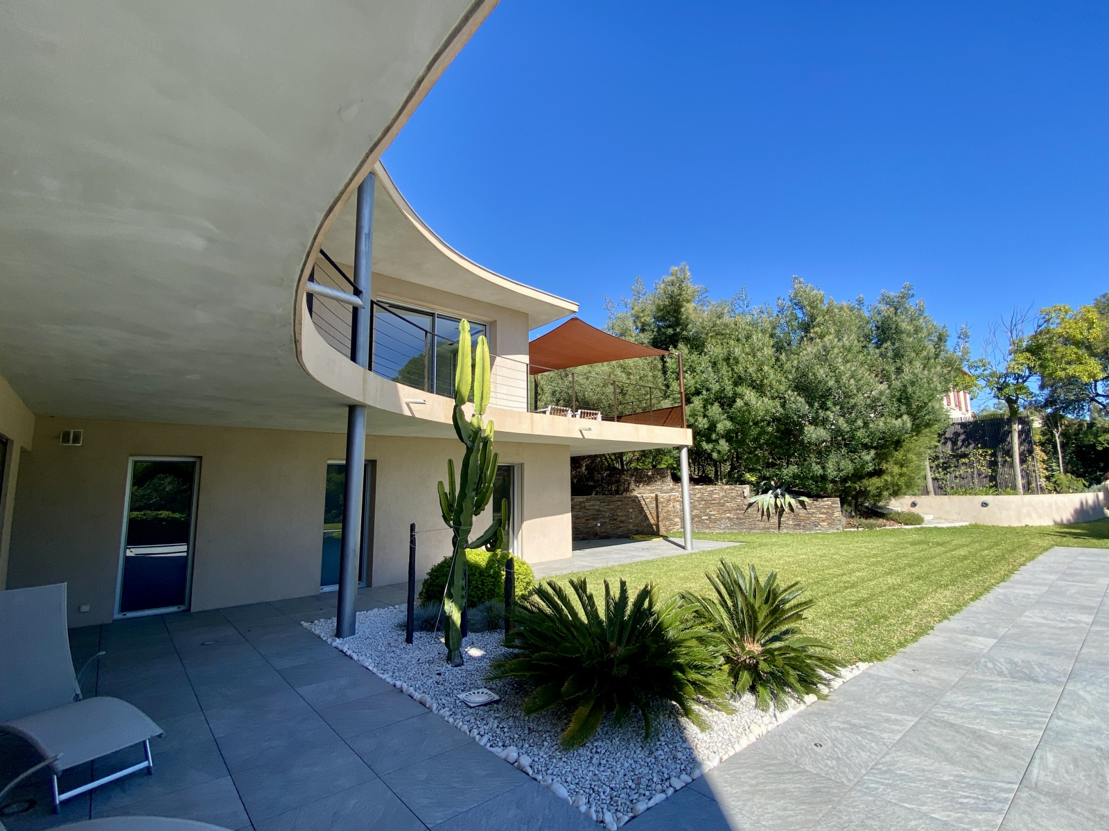 Idéale pour recevoir famille et amis, une grande terrasse couverte donne sur la piscine chauffée au mileu d'un jardin paysager d'environ 2000m2.